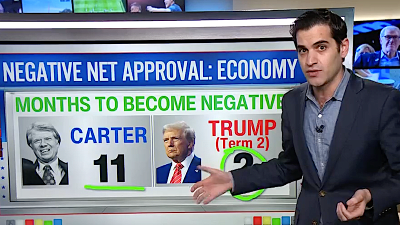 When considering economic downturns, one might recall Jimmy Carter and the recession during his tenure, correct?” Enten remarked. “It took him 11 months to reach a negative net approval rating on the economy, stretching till December ’77 or early ‘78. In contrast, Donald Trump achieved a net negative approval rating within just two months of taking office. This makes him the quickest president ever to turn negative. Compared to Carter, it’s clear—two is less than eleven. While Carter required considerable time, Trump swiftly faced voter disapproval.”