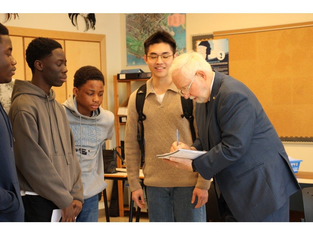 The Queen’s University professor emeritus took time with each student who wanted to talk to him during the question period and after, signing autographs and taking photos.