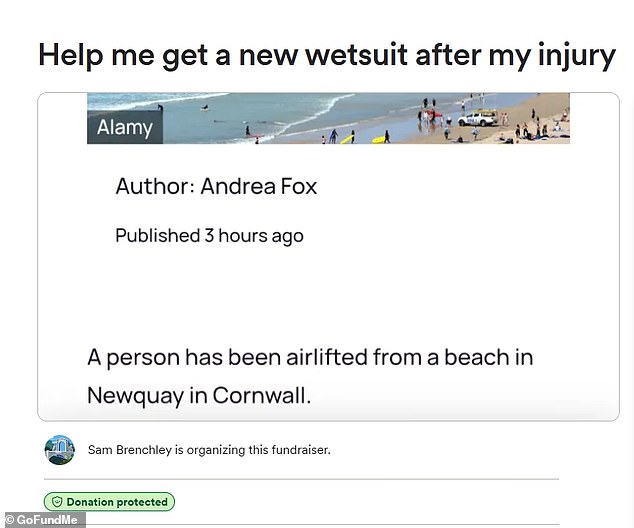 Sam Brenchley, who received a hit to the head from his surfboard at Fistral Beach in Newquay, Cornwall, started a GoFundMe campaign to gather £350 when his wetsuit was inadvertently sliced off him during the rescue.